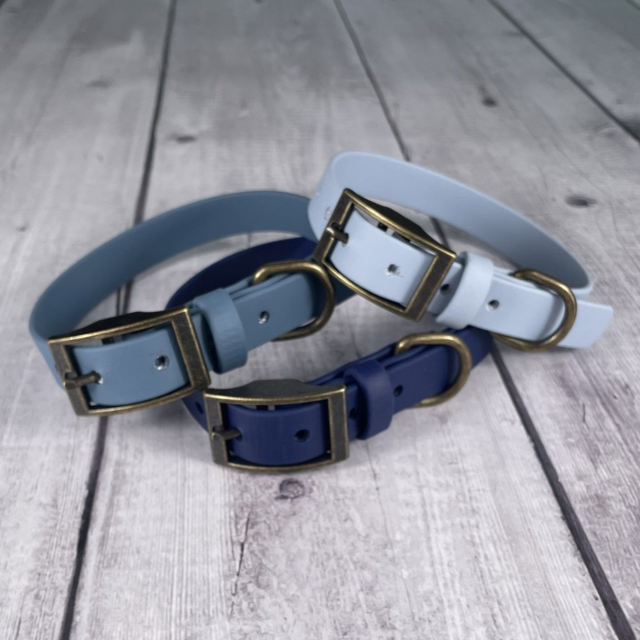 Introducing our handmade Denim Waterproof BioThane® Collar. A high quality, extremely durable collar that is perfect for dogs who love to adventure, whether that's rolling in mud, splashing in puddles, swimming or simply exploring the outdoors - this collar keeps up with every adventure! BioThane® is a great low maintenance alternative to leather although it looks and feels very similar.
